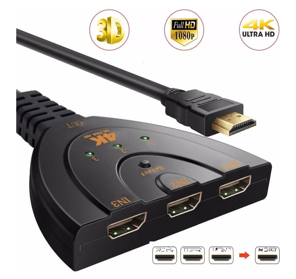 3 in 1 HDMI routes high definition video (in multiple resolutions up to 1080p) and digital audio from any one of the three sources to display units
