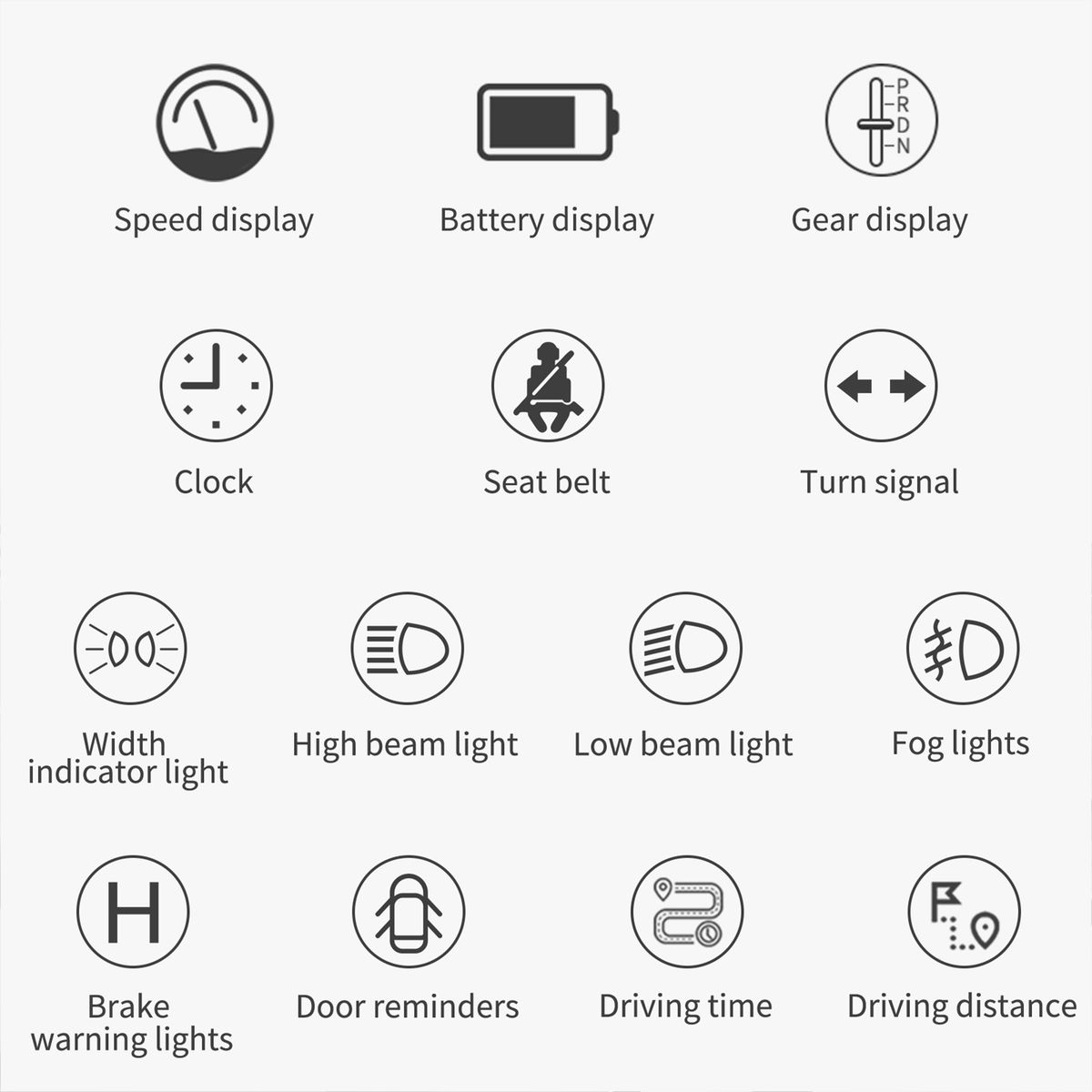 Multiple alarm functions to remind: Over-speed alarm, low voltage reminder, low battery, door left open, unbuckled seat belt, brake warning light.