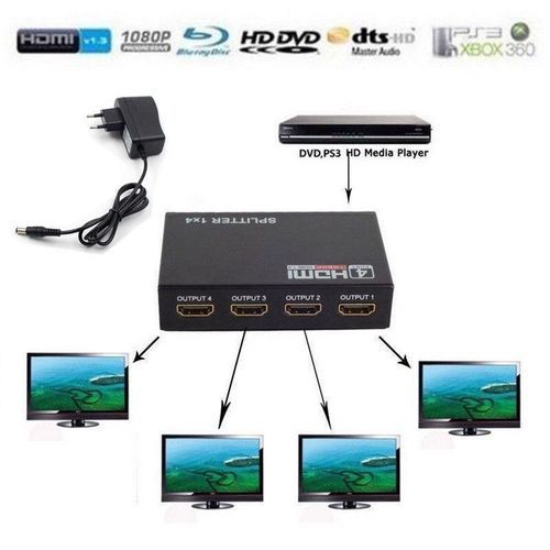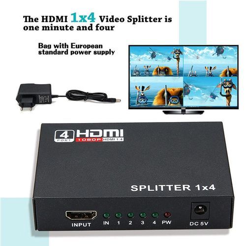 DC Power supplyManual instructions HDMI Splitter 1X4 4 Port Full HD Hub Repeater Amplifier v1.4 3D 1080p 1 in 4 out from Reliable hdmi splitter 1x4 suppliers on 3C. 4 Way HDMI splitter, distributes the input HDMI signals to 4 identical HDMI output. These 4 outputs are synchronized. Best solutions for digital entertainment center, HDTV retail and show site. HDTV, STB, DVD,PS3 and projector factory, space an security concerns data center control, distribution, conference room presentation.