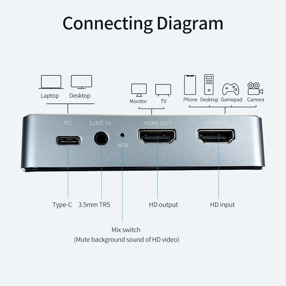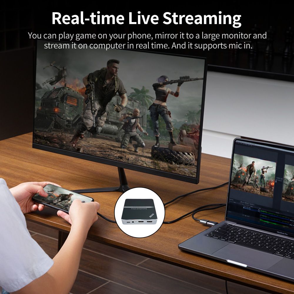 This HD to Type-C Video Capture supports HD video passing through with resolution up to 4K60Hz HDR and recording resolution up to 4K30Hz. And it enables you to input voice through mic when streaming video in real time.