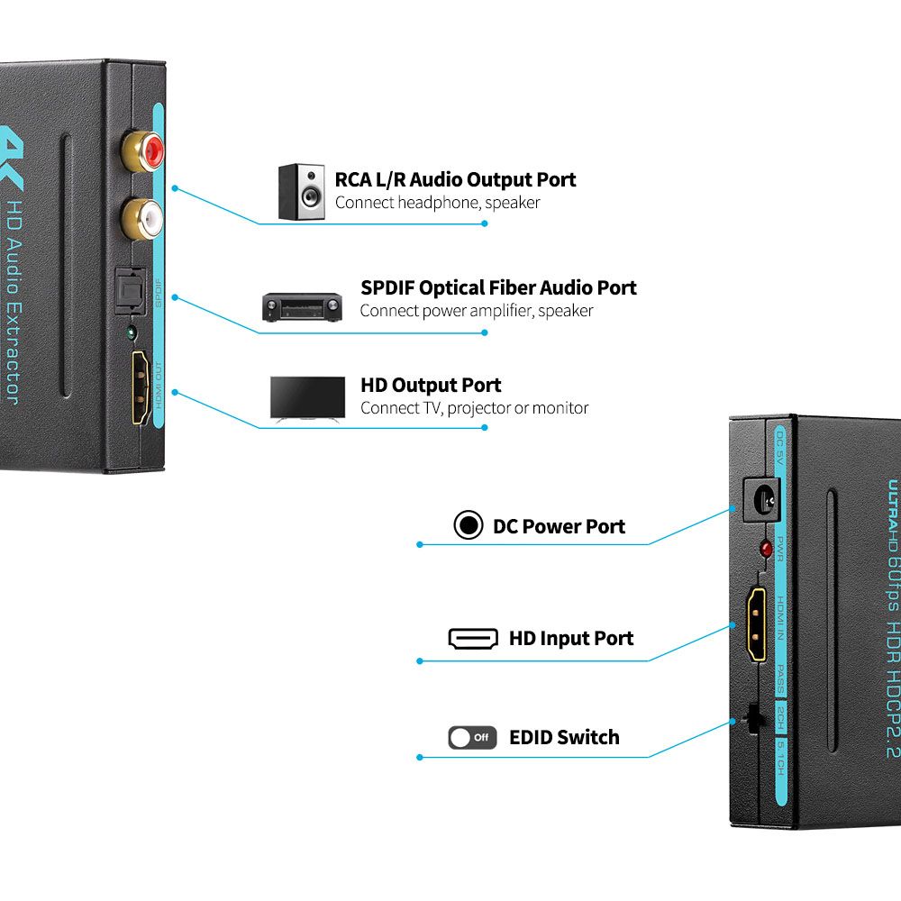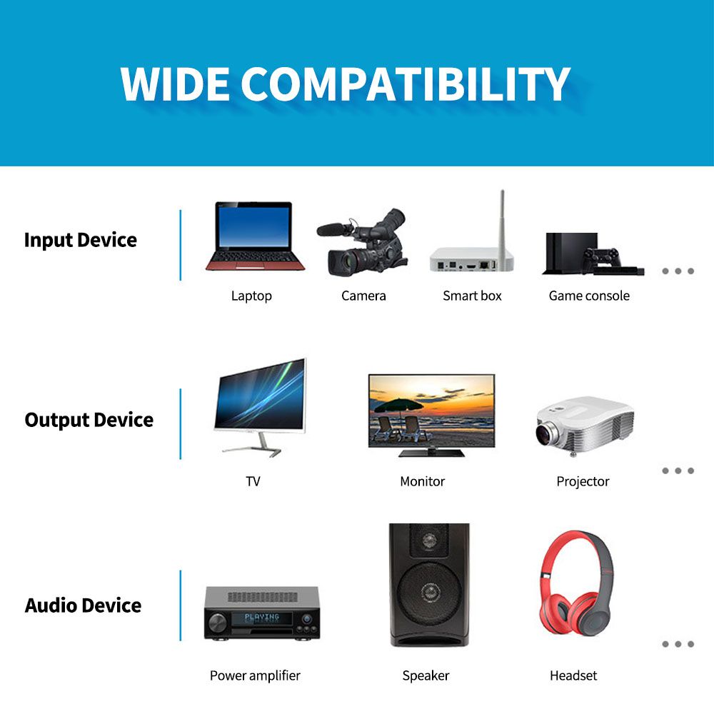 Compatible with TV, projector, monitor and other HD input devices, also support power amplifier, speaker and other audio devices.