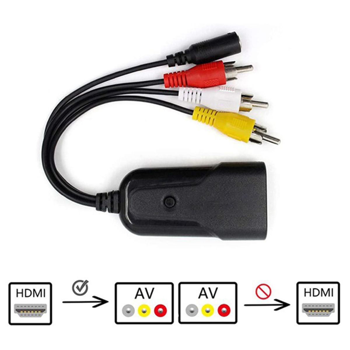 Detailed Information About The Product:Mini HDMI-compatible A-V signal adapter, can convert DMI-compatible video signal or audio signal to AV (CVBS) composite video signal and FL/FR stereo audio signal, and support DVI system sub-line signal.
