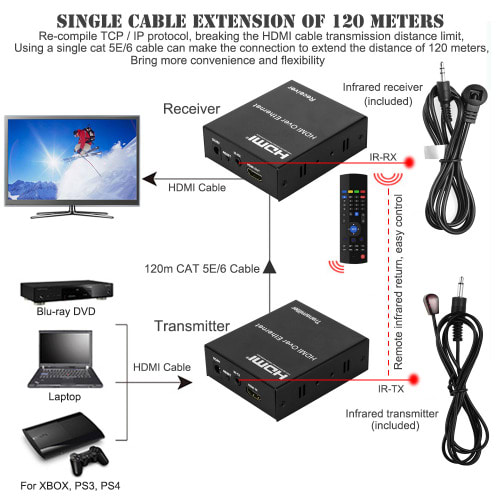 120m HDMI Matrix Extender over IP is a device based on the standard TCP/IP protocol for transmitting HD audio and video source over LAN . It transmits your HD display with the high resolutions up to 120 meters away from your HDMI or DVI-D source by using one CAT5e/6 cable. At the same time, it’s also convenient to transmit HDMI audio and video source by point-to-point, multipoint-to-multipoint and cascade connection mode.