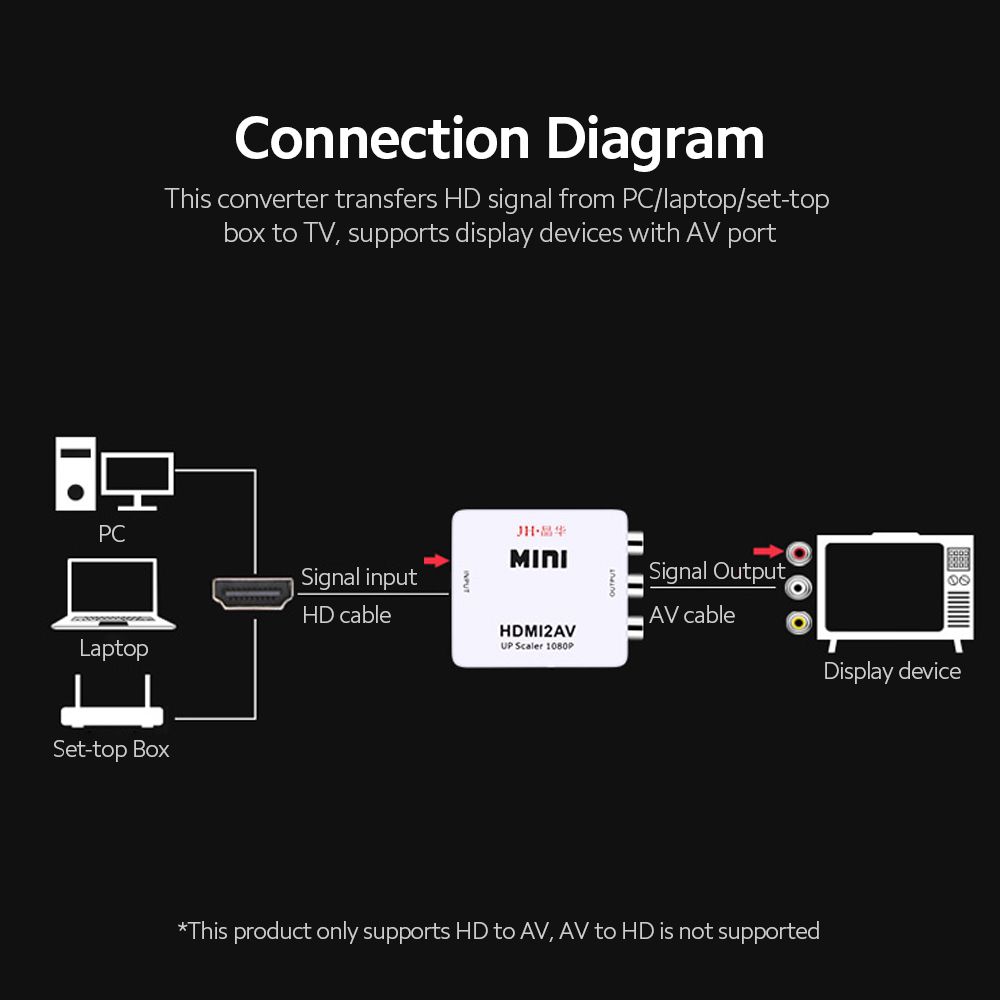 Features:- This converter converts HD digital signal to AV(CVBS) composite video signal and FL/FR stereo audio signal, and converts HD audio signal to regular TV, monitor and other CVBS receiving devices with AV interface.