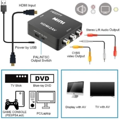 RCA to HDMI, No need to install drivers, portable, flexible, plug and play. Low Power Stable work.
