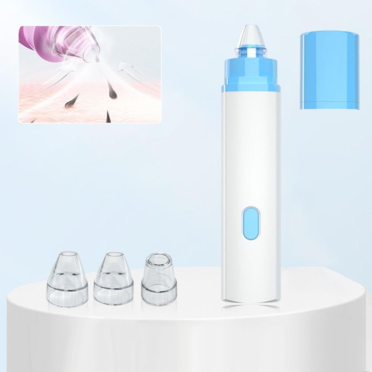 3 suction heads for free adjustment, widely suit different skin types. Small round mini tip, suitable for small areas such as the nose tip/perinasal, for local deep cleaning; Elliptical medium hole tip, suitable for nose wings, fit the curve of the nose circumference for multi directional cleaning; Round large hole tip, suitable for use around the nose, quickly removes blackheads of large areas.