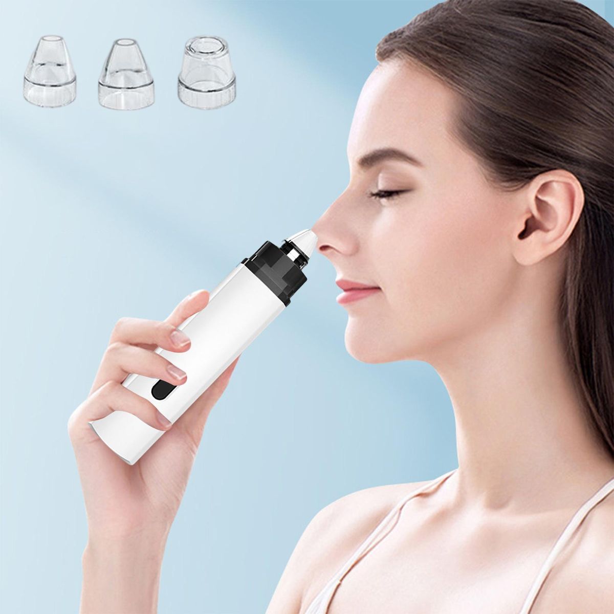 3 suction heads for free adjustment, widely suit different skin types. Small round mini tip, suitable for small areas such as the nose tip/perinasal, for local deep cleaning; Elliptical medium hole tip, suitable for nose wings, fit the curve of the nose circumference for multi directional cleaning; Round large hole tip, suitable for use around the nose, quickly removes blackheads of large areas.
