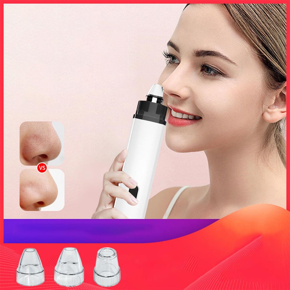 3 suction heads for free adjustment, widely suit different skin types. Small round mini tip, suitable for small areas such as the nose tip/perinasal, for local deep cleaning; Elliptical medium hole tip, suitable for nose wings, fit the curve of the nose circumference for multi directional cleaning; Round large hole tip, suitable for use around the nose, quickly removes blackheads of large areas.