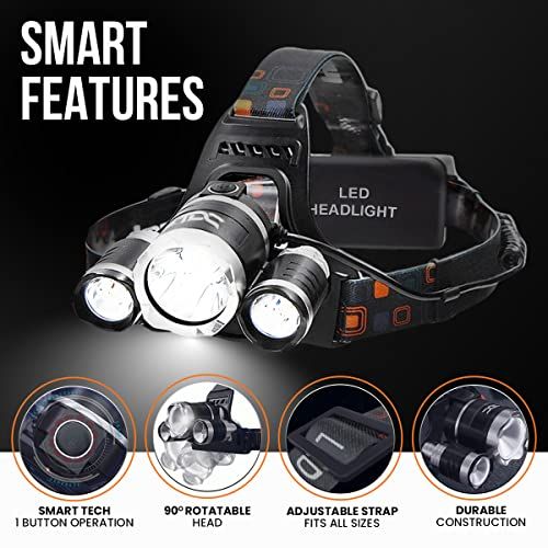 Details: With our tatial headlamp your amp and bakpaking gear essentials are at their best and you an now ope with any low-light situationAll weather onditions ready thanks to the IP54 waterproof omponents and strong ABS and alloy aluminium. Forehead light.You an easily light any orners thanks to the-degree rotation of the head flashlight headlamp.Outdoors, alone or in ompany you are always visible and you an attrat attention with the strobosopi funtion. Long range flashlight 0mPowerful flashlight for Night Hunting and Fishing: you an get a good look at your prey and prepare to do your best.Work in dark environments suh as attis and have your hands free to use the tools you need thanks to the super bright headlamp. Great as a hard hat light or bike helmet light and mehani headlamp.Whether you are working, playing sport or on a vaationYou will always be ertain to have a strong and reliable light soure that leaves your hands free.ATTENTION:Please remove the plasti film wrapped around the batteries before use.Do not irradiate the eyes diretly as the bright light ould damage the eyes.Insert the batteries in the orret polarity.Avoid using your headlight flashlight during harging.PACKAGE INCLUDES:1x Headlamp LED1x USB Charger1x USB Cablex 180 Batteries1x User Manual ustomers trust us for the quality of our produts. All our produts are guaranteed for 24 months!Design and funtionality. Get yours by liking Buy Now!