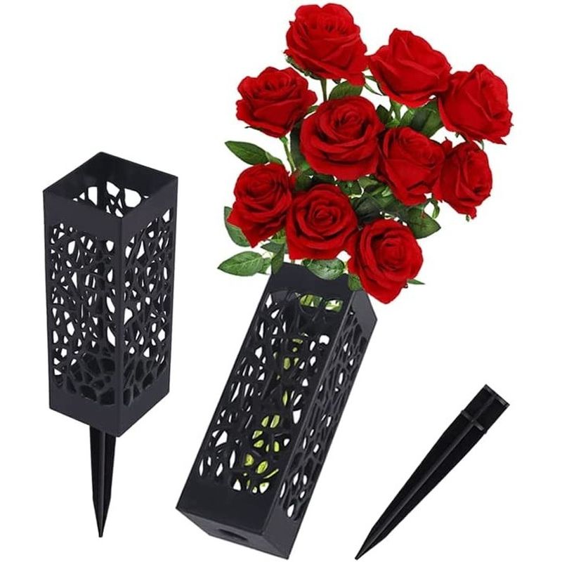 Unique Hollow Drainage design:Our memorial cemetery floral holder with special hollow design that makes the withstand harsh rainstorms and keep your flowers upright.And makes our flower holder become more aesthetic than the common cone vase. Extra-Long flower holder prong design:Our cemetery plastic floral holder with 5.3 inch extra long support stake design.More longer than usual vases.It will keep insert more sturdily in your lawn and high winds won't blow your flowers over. Weatherproof high quality made:Made of premium plasitc.Durable and weatherproof.The square vase with beauty hollow drainage design to withstand heavy rain or exceive sunshine.Together with durable long support stake,that perfect for long-term use. Easy to use:1 Sets flower holders in the package.Including 1PC square vase and 1PC support stake part.The square vase with round hole in the bottom,just let the round side of support stake acro the hole to achieve the 2 parts together.Then insert the sharp side to the lawn and put your flowers inside the upper square part. Wide to use:Our flower holder great to offer a secure spot for memorial bouquets.Perfect for funerals, cemeteries and grave sites.And also good to decorate indoor and outdoor parties and special events.Like Halloween party, haunted house,carnival, fancy dre party, parade, trick or treat festival and more.
