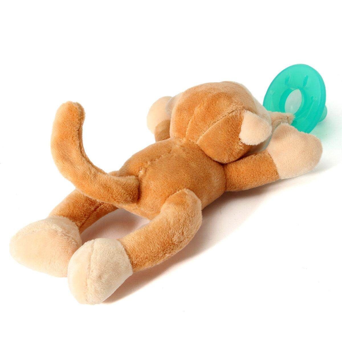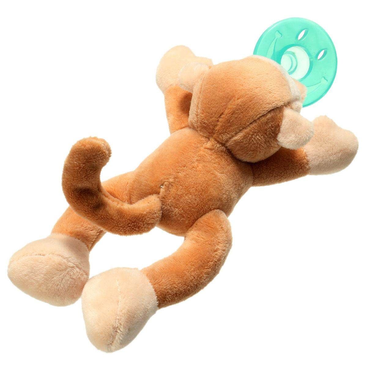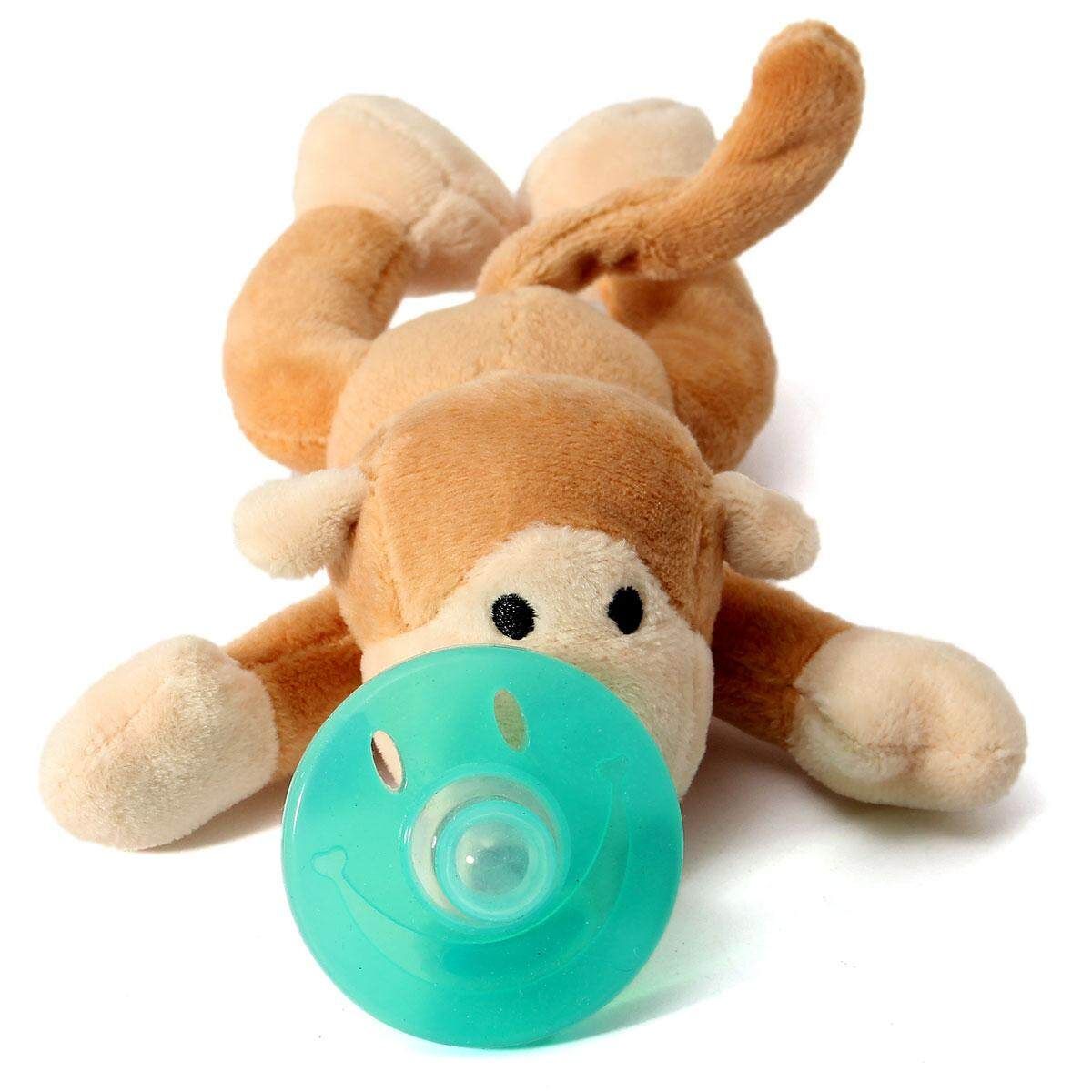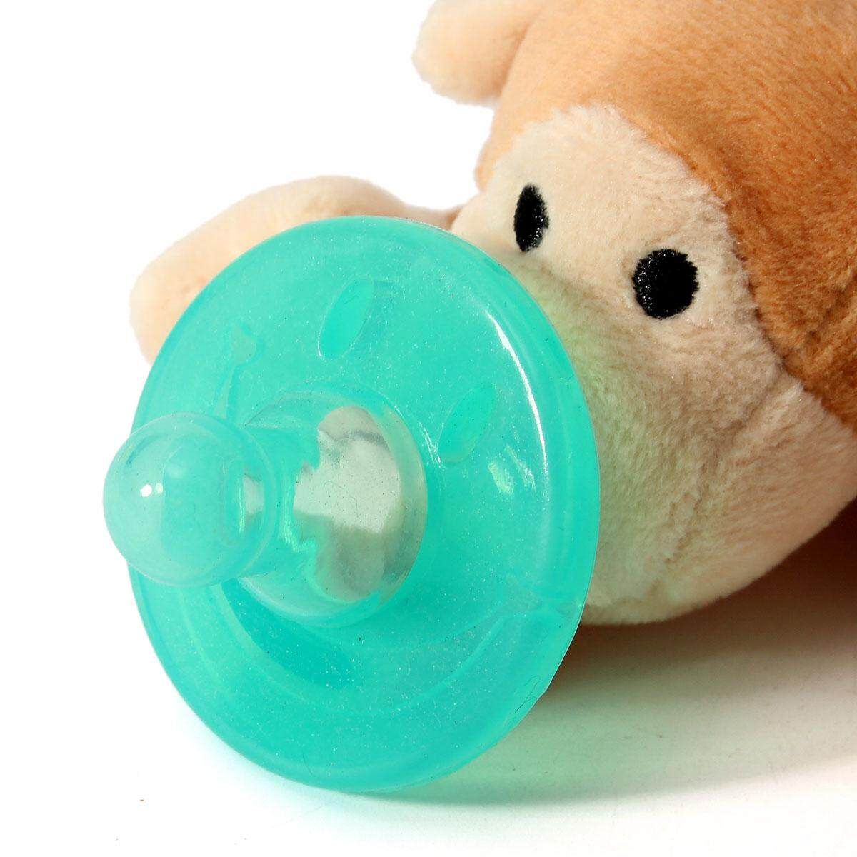 2, Plush animal makes it easy for baby to grasp and manipulate the pacifier.
