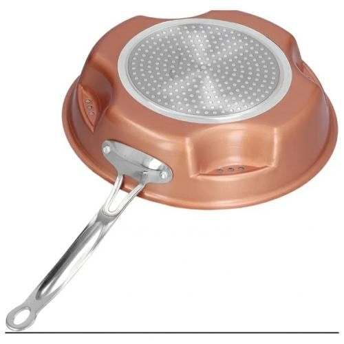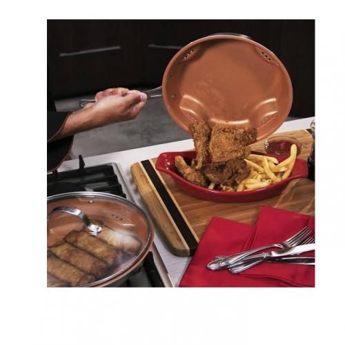 NON STICKY AIR FRY Pan fries without oil or any other source of fat. Non sticky air stir fry trilogy is an innovative, multi-purpose healthy, dry cooker, with which you can fry for the whole family without oil and it distributes heat evenly. It has three heat towers for increased heat exchange on the edge of the pan that allow the air to circulate inside the pan and dry cook the food.
