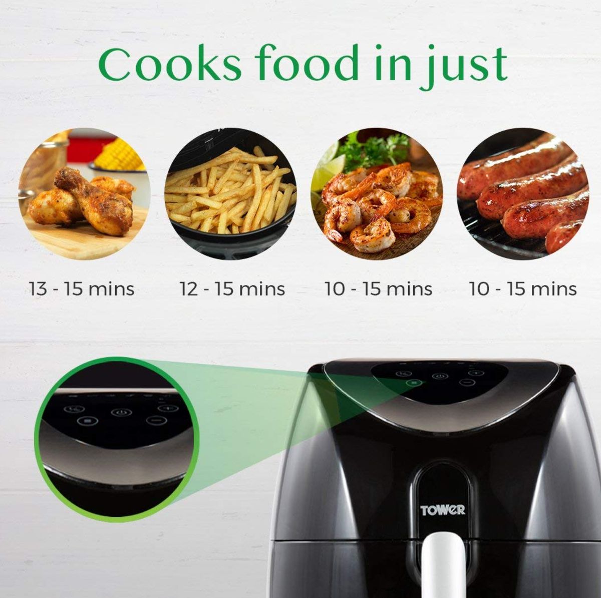 hot air circulation technology of the 4.3 Litre Tower air fryer. With only a small amount of low calorie cooking spray the enhanced airflow creates a crispy texture as it fries across a range of ingredients, including vegetables, chicken, chips and cakes. It's also very easy to clean, as the pull out drawer and removable basket require just a simple hand wash to clean. It's the ideal kitchen accessory if you want to make your mealtimes that much better.