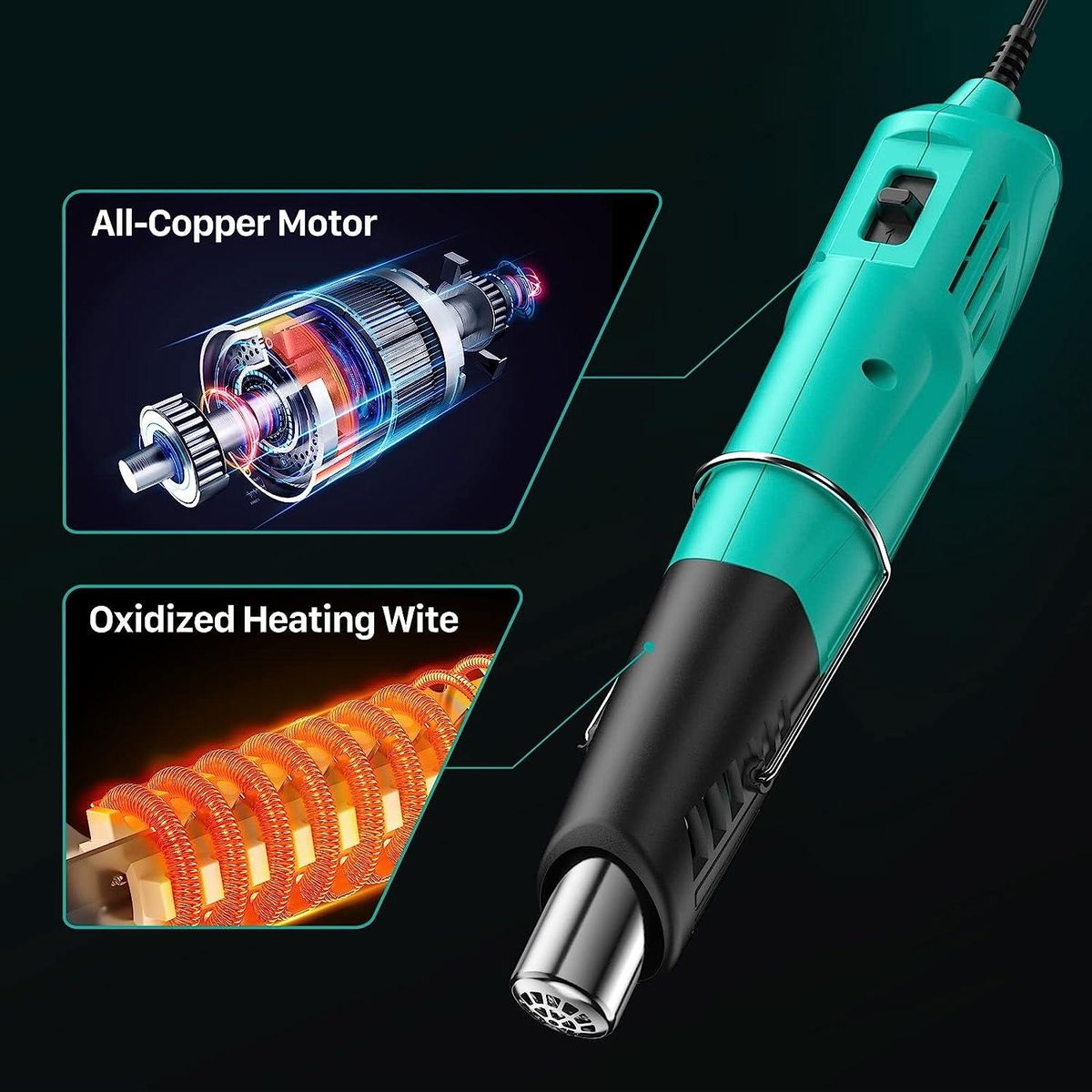 【High Quality Materials】Crafted from ABS plastic and stainless steel, the entire heat gun is corrosion-resistant and durable. The pure copper motor ensures a quiet environment and is more energy-efficient than traditional motors, making it both practical and efficient.