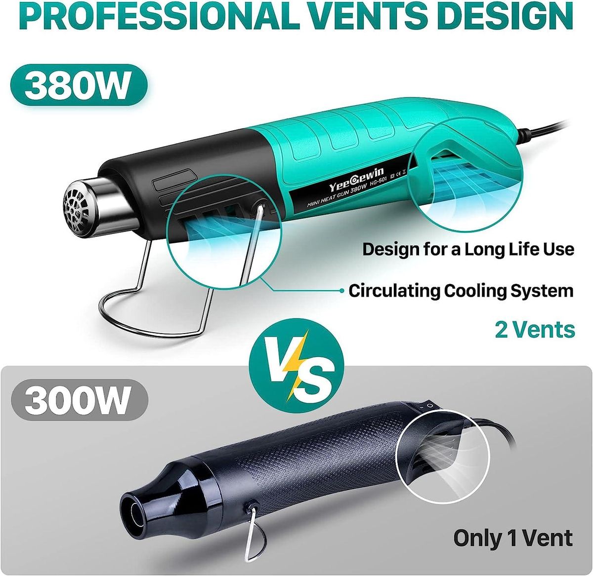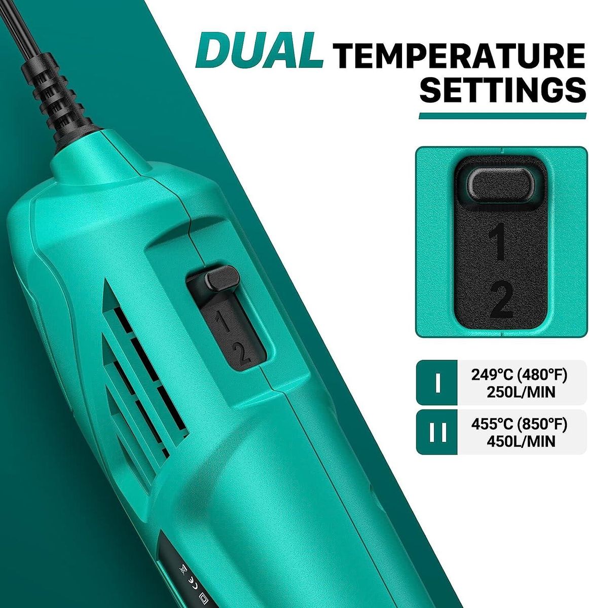 【Two Temperature Settings】The YEEGEWIN 380W mini heat gun features two temperature settings to accommodate a range of projects. Use the low temperature setting (249°C, 100L/min) for simple crafts, and switch to high temperature (455°C, 500L/min) for smaller household jobs that require higher temperatures, such as when defrosting food.