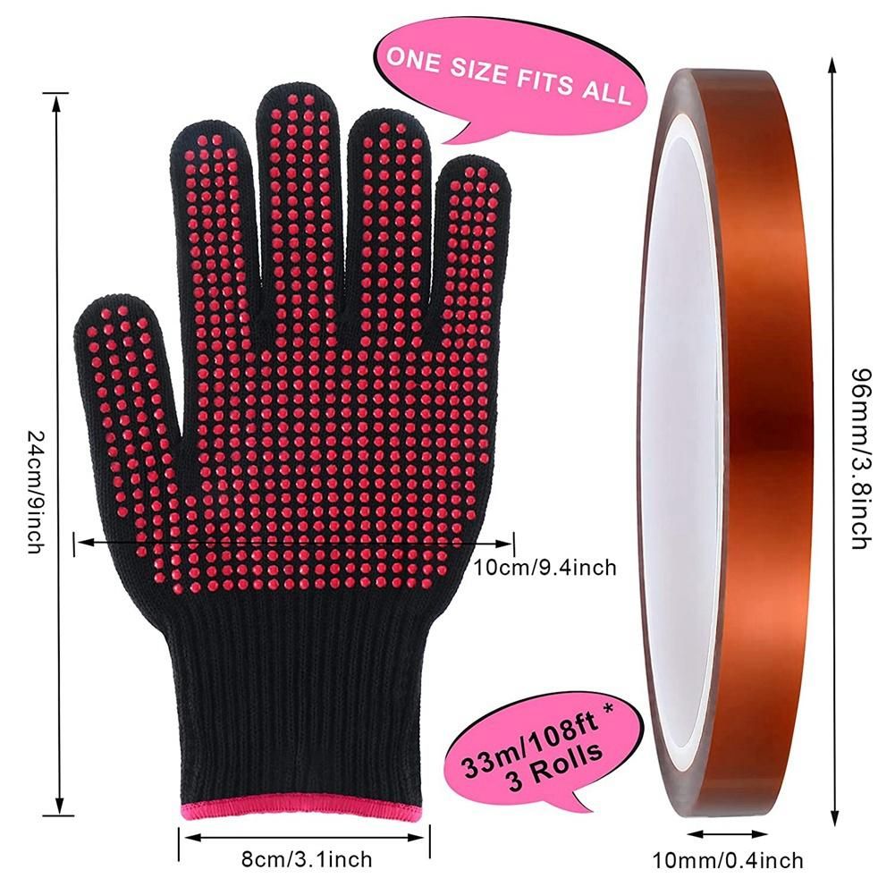 Proper size: each piece of curling wand mitt measures approx. 9.4 x 3.9 inches/ 24 x 10 cm, appropriate for most people; The width of heat resistant tape is around 2/5 inch/ 10 mm and the length of it is around 108 feet/ 33 meters, so the length is enough for your use.