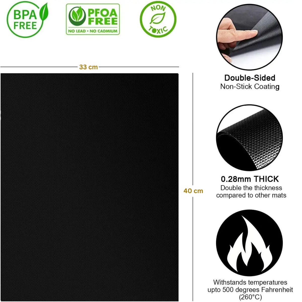 This contains a 2 Pack Non-Stick, Heavy Duty Extra Thick (0.3mm) Teflon barbeque (BBQ) grill Mat. It is 40 cm x 33 cm which makes it a large grill mat for its category in the market. it is Heat Resistant up to 260 C which makes it ideal for home kitchen use in microwaves, top of electric or gas cookers, as well as charcoal or gas grills. You can also cut to size to fit your use. It is dishwasher safe and easy to clean because it is non stick which means food does not stick on this material and any food residue on this product is easy to clean. This product is BPA and PFOA which makes it eco-friendly and safe to use. This product is also durable and re-useable due to its unique characteristics which makes this the ideal partner for baking, grilling, and toasting. it also ensures you have a spill free kitchen experience