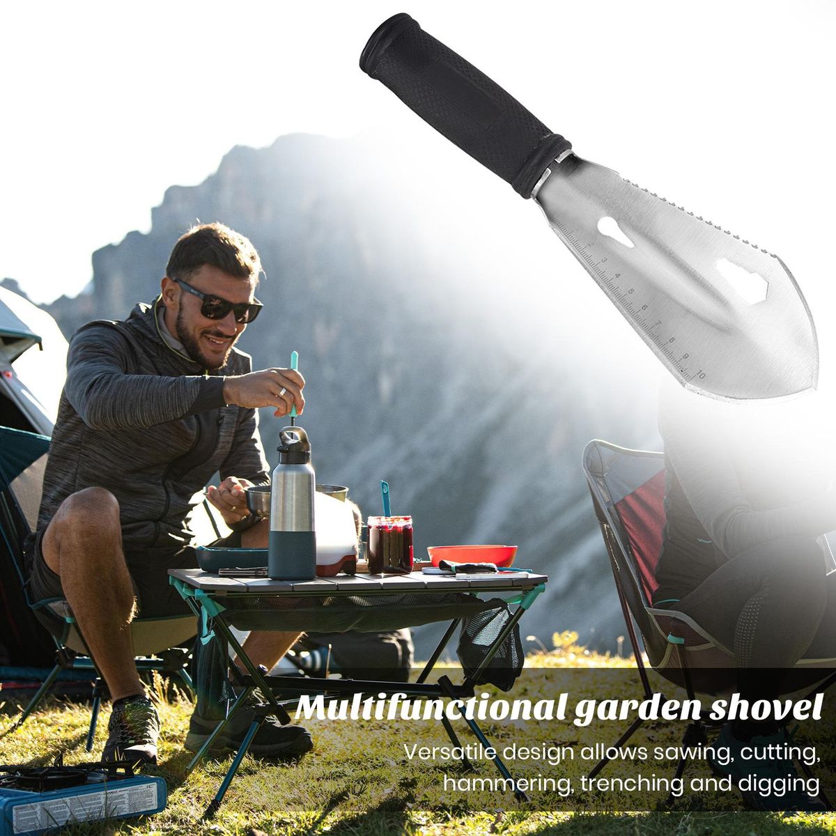 Made of stainless steel and heat-treated for strength, this compact folding shovel allows for sawing, cutting, hammering, trenching, and digging making it a true all-in-one tool. whether you're backpacking, fishing, hunting, or simply tending to your garden, our garden shovel is the perfect companion. order now and experience the convenience of our garden shovel with sharp spade design!