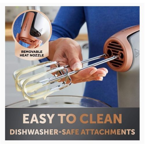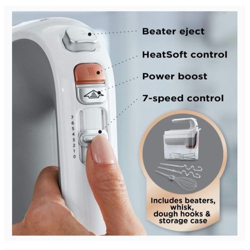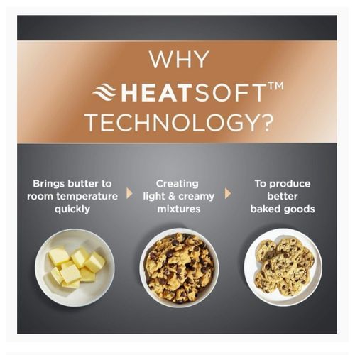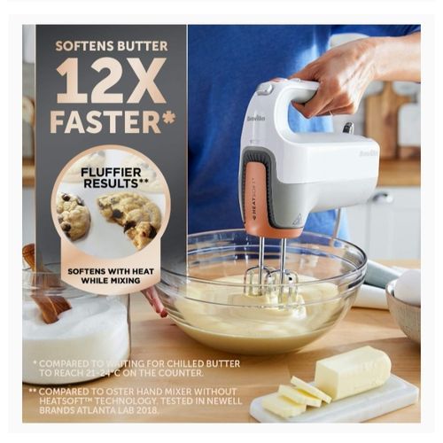 Introducing The Breville Hand Mixer with HeatSoft™ Technology with Breville Hand Mixer, there's no wait to bake! Innovative HeatSoft™ Technology allows you to soften cold butter while mixing, in one simple step. By using gentle warm air, the Breville Hand Mixer quickly brings cold butter to room temperature. The key to fluffier results is using room temperature butter. Using cold or melted butter can affect the quality of your recipes. Using melted butter results in baked goods that are too flat and deflated. But softened, room temperature butter is JUST right for making, fluffy baked goods. And now you can do it faster with the power of HeatSoft technology! The Breville Hand Mixer softens butter 12 times faster, so there's no wait to bake. The versatile 7-speed control allows you to handle any type of mixture, and the Boost Power button gives you the extra boost needed when tackling especially thick mixtures. An Easy Eject Button makes for quick and convenient clean up and the Removable Magnetic Nozzle is dishwasher safe.
