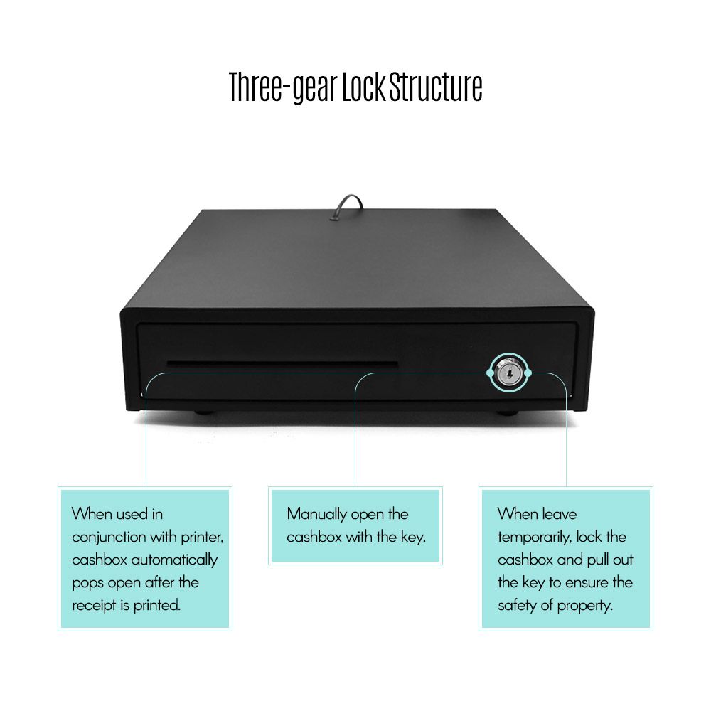 Three-gear lock structure -- when used in conjunction with printer, cashbox automatically pops open after the receipt is printed; manually open the cashbox with the key; when leave temporarily, lock the cashbox and pull out the key to ensure the safety of property.