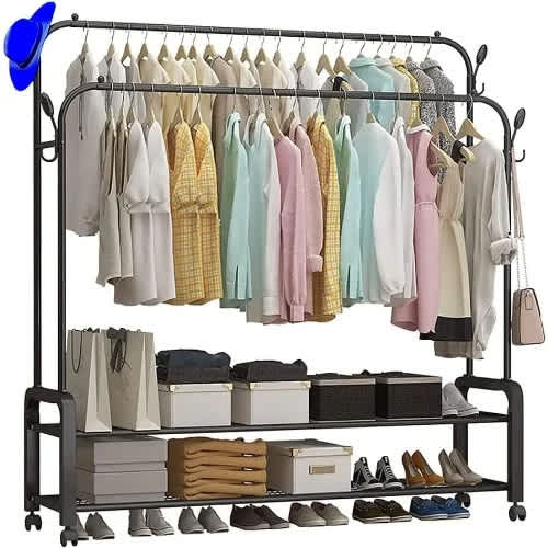 This easy-to-assemble clothing rack has a nice elegant color that fits well in any room, as well as provides easy access and storage of all your garments. In addition to this, the rack features shelves you can use for keeping things like baskets shoes.Our portable garment rack features a double rail rods for easy hanging, helps you keep more clothes as expected and get rid of mess. It is ideal for use in the laundry room, boutique and bedroom among other space.This multifunctional clothes rack with double rail rods, provides much space to organize all of your clothes and keeps them organized & wrinkle-free. This stylish clothes rack is affordable for you, it is constructed from metal iron frame to serve for years and accommodate up to 35kg. With much spaces to keep your clothes clean and tidy. The four caster wheels make it excellent for use on all floor surfaces.This versatile rack provides enough space for all your clothes, which makes it appropriate for both personal and commercial use. Moreover, it can move and lock easily thanks to the four casters ( two of them is lockable). The process of assembling is super easy and fast.