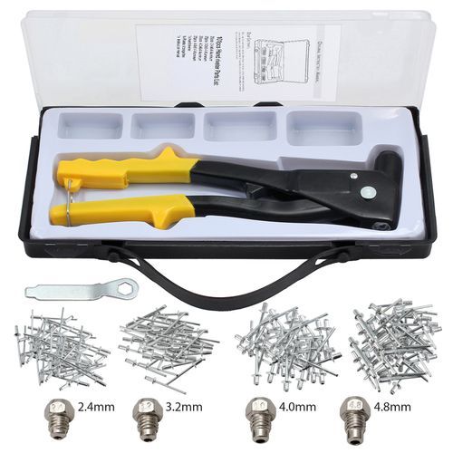 [More Sturdy] Our riveter has a high strength aluminum body with drop forged carbon steel upper handle. The component of riveter gun adopts heat treated that makes the gun more sturdy and durable. The fulcrum pin is made of cold-formed, heat treated steel to prolong the using life of rivet gun. Spring-loaded handle ejects rivet stem automatically. Whether you're a novice or seasoned riveter, this gun will accomplish your needs. [Labor-saving] The rivet gun adopt ergonomics design to greatly save your strength. Powerful and do not require much strength to make a perfect riveting. The thick PVC grips provide comfort for the user. Anti-slip handle make work easier and improve user's work efficiency. Saving your time make you to do more things. The unique design of rivet gun allows for use with one hand. [Easy to Squeeze ] The Pop Rivet Gun kit has a small wrench that is handy for removing the adapter for the different size rivets. This riveter will reliably grip your mandrel and make sure it seats correctly. Ar 2-3 tries, the pop rivet gun would snap off the rivet pin. This riveter comes with four mounted nose pieces 3/32", 1/8", 5/32", and 3/16". Ar rivet finally was finished, you wilet the remaining pin out of the gun easily. [Convenient Storage] In the bottom of pop rivet gun, there have a stainle buckle. When you don't use it, you can buckle the safe lock. The pop rivet gun will become small to save your space. And it will also become portable, which is convenient for your work and life. Portable box ensure you take it go to any place that you want to go