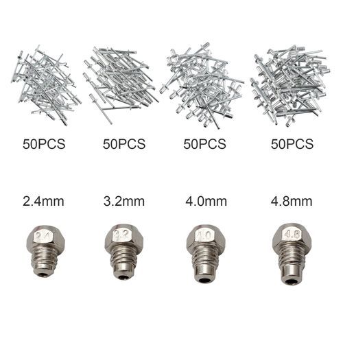 1 PC rivet gun with 4 different sizes heads 1 PC Head wrench 1 PC Portable case 50 PCS 3/32 inch x 1/4 inch rivets 50 PCS 1/8 inch x 1/4 inch rivets 50PCS 5/32 inch x 1/4 inch rivets