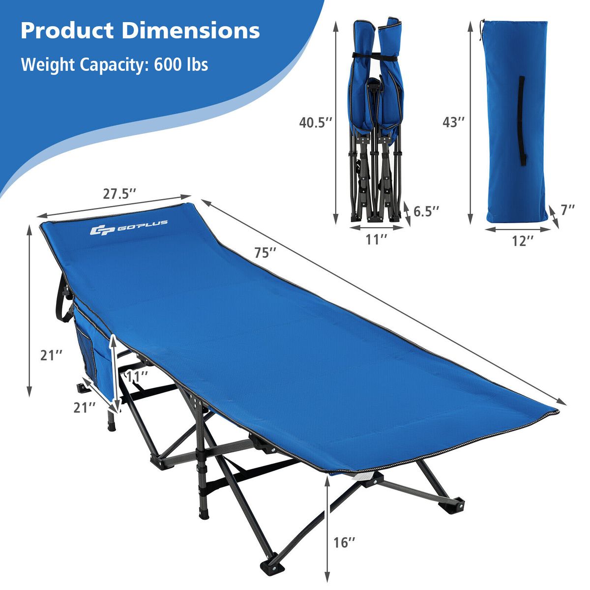 - Equipped with 10-point structure and x-shaped metal legs, the camping cot features strong weight capacity of 600 lbs.