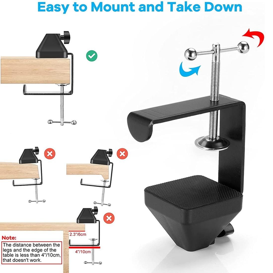 [Heavy-Duty] Upgraded Desk Mount Clamp has 4 times lager contact area than most microphone stand holders on the market. Easily clip to any desk up to 2.4inch/60mm thickness. In addition, the headset hook is integrated into the desk clamp.