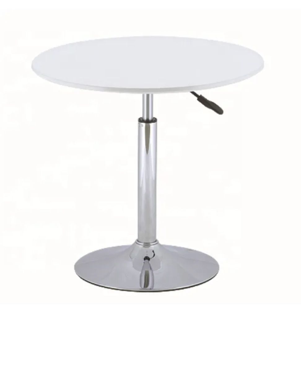 This height-adjustable bar table has a 23.5-inch round tabletop that is large enough to accommodate a small group of guests. The MDF and aluminum furniture has a stylish yet subtle design that works in both commercial and residential settings. In fact, the height-adjustable bar table has a rotating design that is especially useful in retail stores or trade show booths. This pub table has an adjustable height with an easy-to-use gas lift lever that raises the tabletop between 27.5" and 37.5". This allows users to be either seated or standing around the furniture. Please note that some assembly is required. Dimensions: Overall: 23.5"diam. x 27.5"h to 37.5"h Base: 17.5"diam. Tabletop Thickness: 0.75".Application: Kitchen & Dining