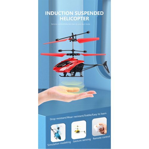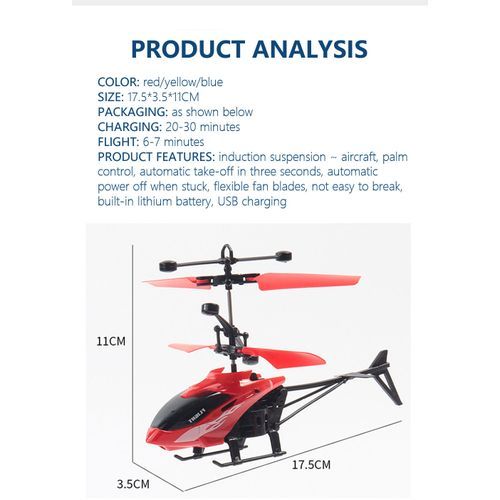 Specification:Product Name: Flying HelicopterMaterial: Plastic+Electric ComponentColor(Optional): Blue(Style 01/04)/Red(Style 02/04)/Yellow(Style 03)Control Method: Gesture Control/ Gesture Control+Remote ControlCharging Time: 10-30 MinutesFlight Time: About 6-10 MinutesFunction: Rise, Fall, SuspensionRemote Control Batteries: 2 x AAA Batteries (Not Included)Suitable Age: 6-14 Years OldProduct size: 18 x 11cm/7.1 x 4.3in(L x W)Package Size: 22 x 14.5 x 5cm/8.7 x 5.7 x 2in(L x W x H)Package Weight: 0.08kg/2.8oz