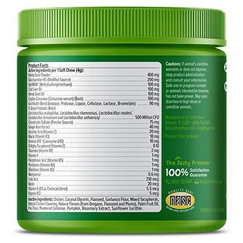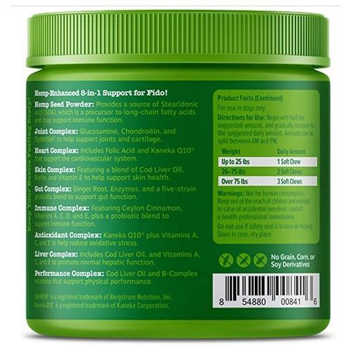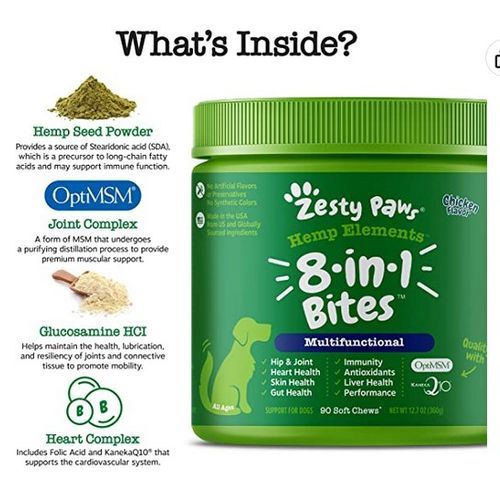 Zesty Paws Hemp Elements 8-in-1 Bites are premium hemp seed enhanced soft chews that provide eight amazing benefits for your dog. These functional supplements support hip and joint function, heart health, skin health, gut function, the immune system, antioxidant levels, liver health, and performance for adult and even senior dogs -- small, medium, or large, and regardless of breed.