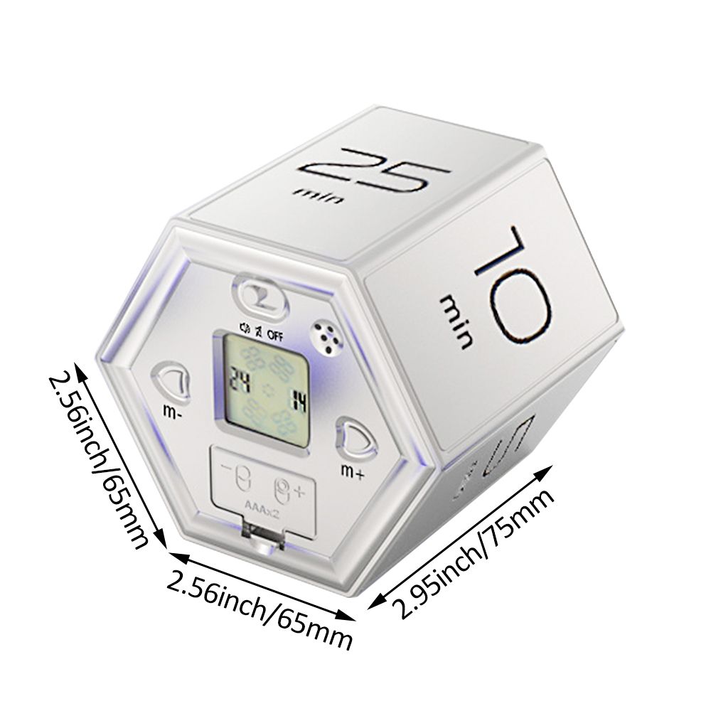 Features:【Simple to Use】Just flip to a particular side for pre-set desk timers, done! No need to press button over and over when you need the standard 1, 5, 10, 25, 30, 60 minutes. You can also set the preset time according to personal need. (2 of the AAA BATTERIES NOT INCLUDED)