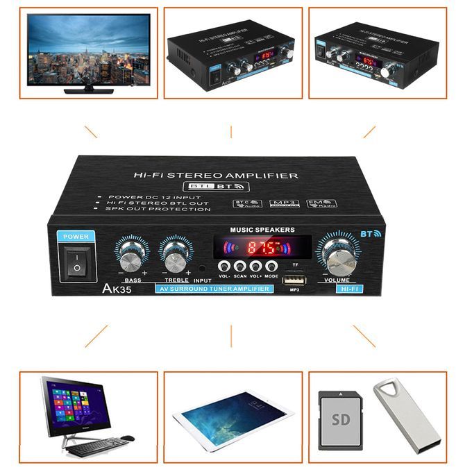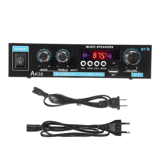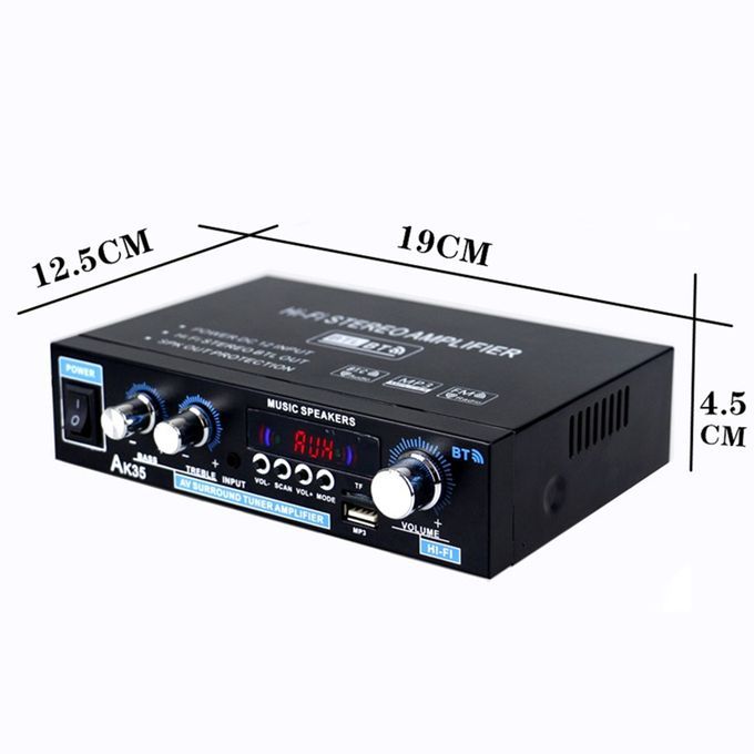 Specifications: Model: AK35 Color: Black bluetooth: Support RMS Power: 30Wx2 Max Power: 300W+300W Voltage: AC 110V-220V / DC 12V 5A Plug: EU plug / US plug Channel: 2.0 SNR: 85 dB Distoration Rate: 0.05% Load Impedance: 4-16? Frequency: 10Hz-20KHz FM Frequency: 87.5-108MHz Size: Approx. 19x12.5x4.5cm / 7.48x4.92x1.77in