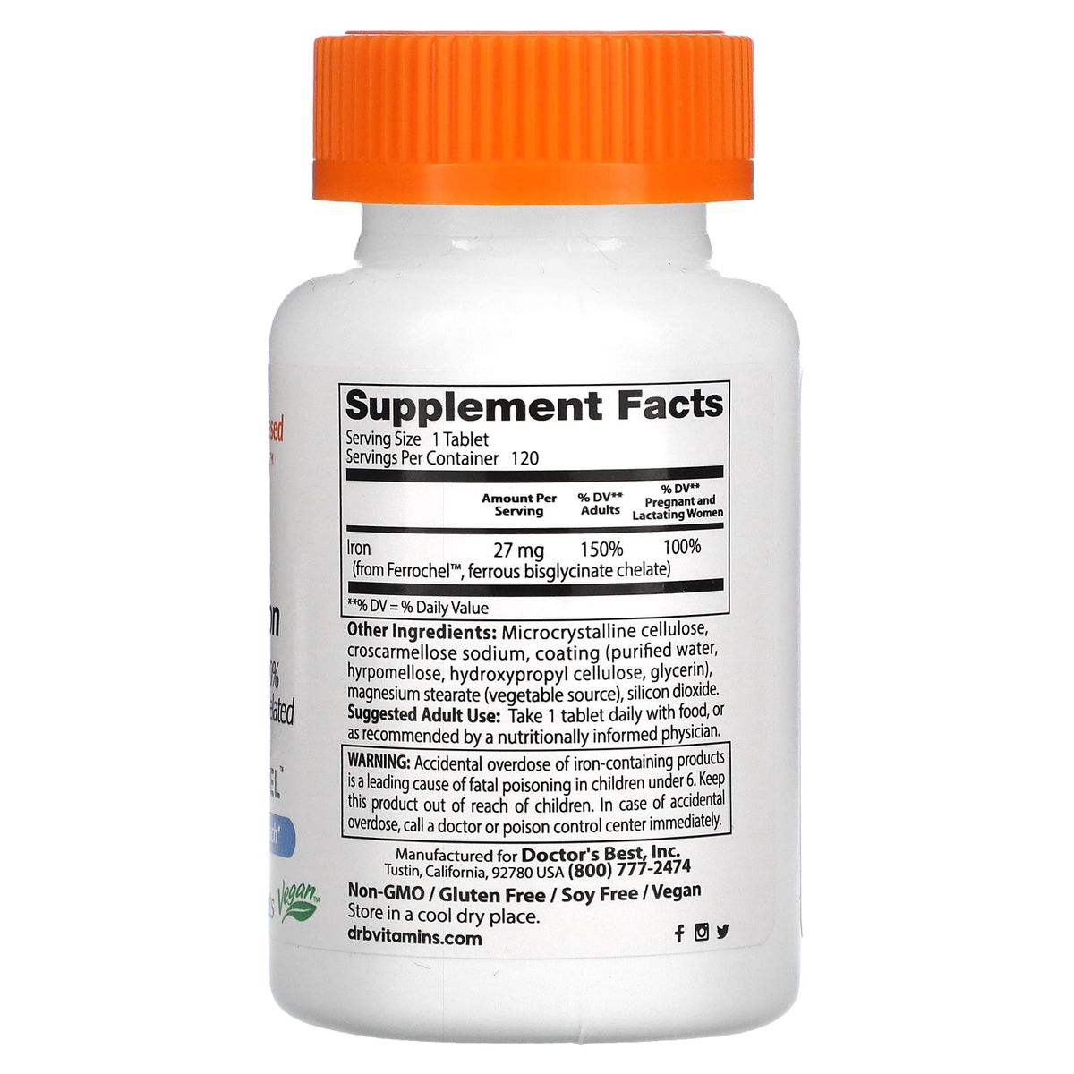 Doctor's Best High Absorption Iron with Ferrochel™ contains chelated iron to help increase bioavailability. Chelation helps iron to be optimally absorbed by our body and is well-tolerated by the digestive system. Iron is an essential mineral that helps in the production of normal red blood cells. It is an important component of hemoglobin which carries oxygen throughout the body.
