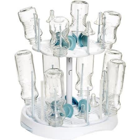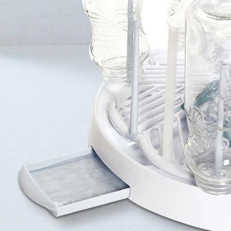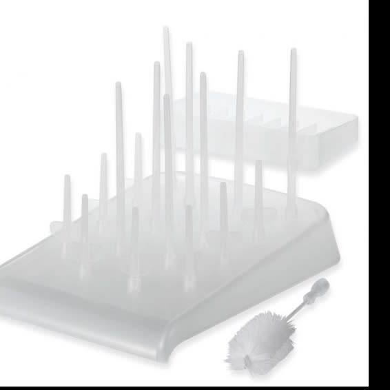 The Drain N' Dry bottle drying rack is a sanitary way to dry baby bottles, nipples, rings pacifiers and training cups. The angled tray allows the water to drain back into the sink.