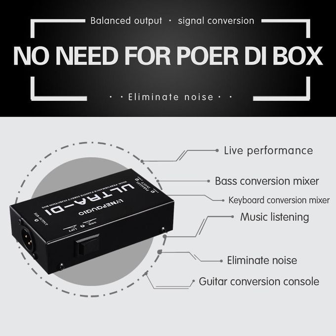 With a DI box, you can easily make impedance matching and ensure lossless audio through long lines, the earthing switch eliminates the AC noise of earth-return circuit.
