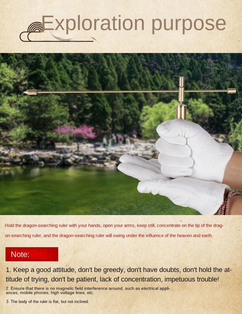 principleThe neutral name is called the probe stick. Some people have turned it into a divination stick, a magic divination stick, and some friends in the geomantic geography circle call it a dragon-seeking ruler, a dragon-seeking stick, a dragon-seeking needle, and so on. This is to use the sensitivity of the human body to release this kind of subtle and delicate induction through the reaction, swing, rotation, etc. of the stick, and turn it into a visible and regular signal, and people can get it from it. Knowing the correct information, you can find people, find objects, explore water sources, mines, monuments, divination, etc., and it is very accurate.