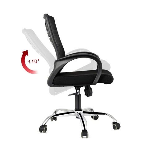 The tilt of the chair in an upright position at 90° by pushing the lever in; pull the lever out to unlock and recline from 90° to 125°. The user can adjust the tension of the free floating tilt to match their body weight. Max Weight Capacity: 150kg.