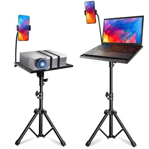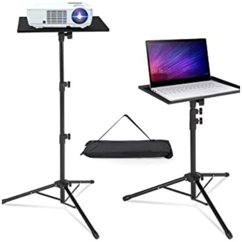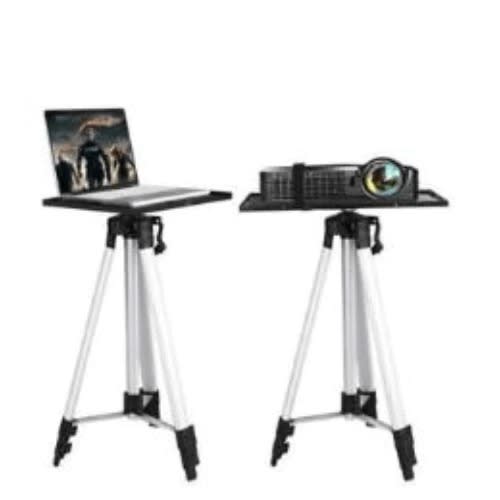 Adjustable Tripod for Projector Heavy- duty tripod bracket can quickly and easily adjust the height from 17.7''to 47.2''.Tray adjustment of 300o.The tray has raised support lips,and sponge gaskets and elastic bands to protect electronic equipment.Clip-type knobs and elastic bands hold the shelf and tray in place.