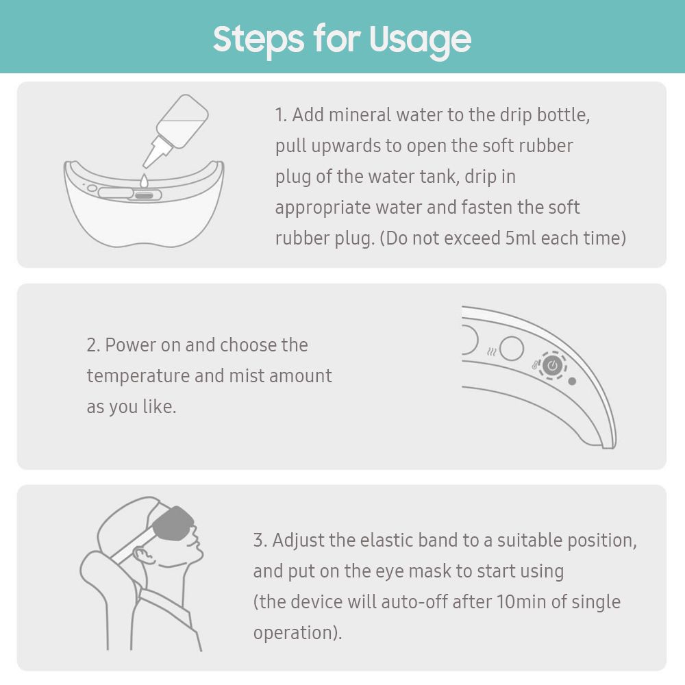 Third, Adjust the elastic band to a suitable position, and put on the eye mask to start using (the device will auto-off after 10min of single operation).