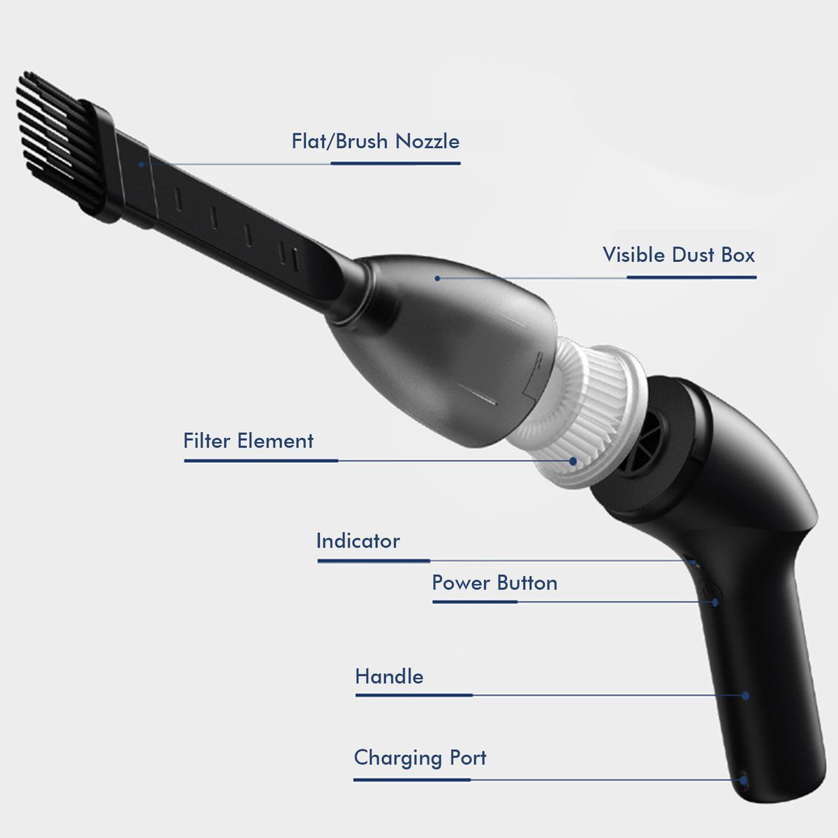 The filter components are detachable and washable. Suitable for car, home, windowsill, gap, computer, bookshelf cleaning.