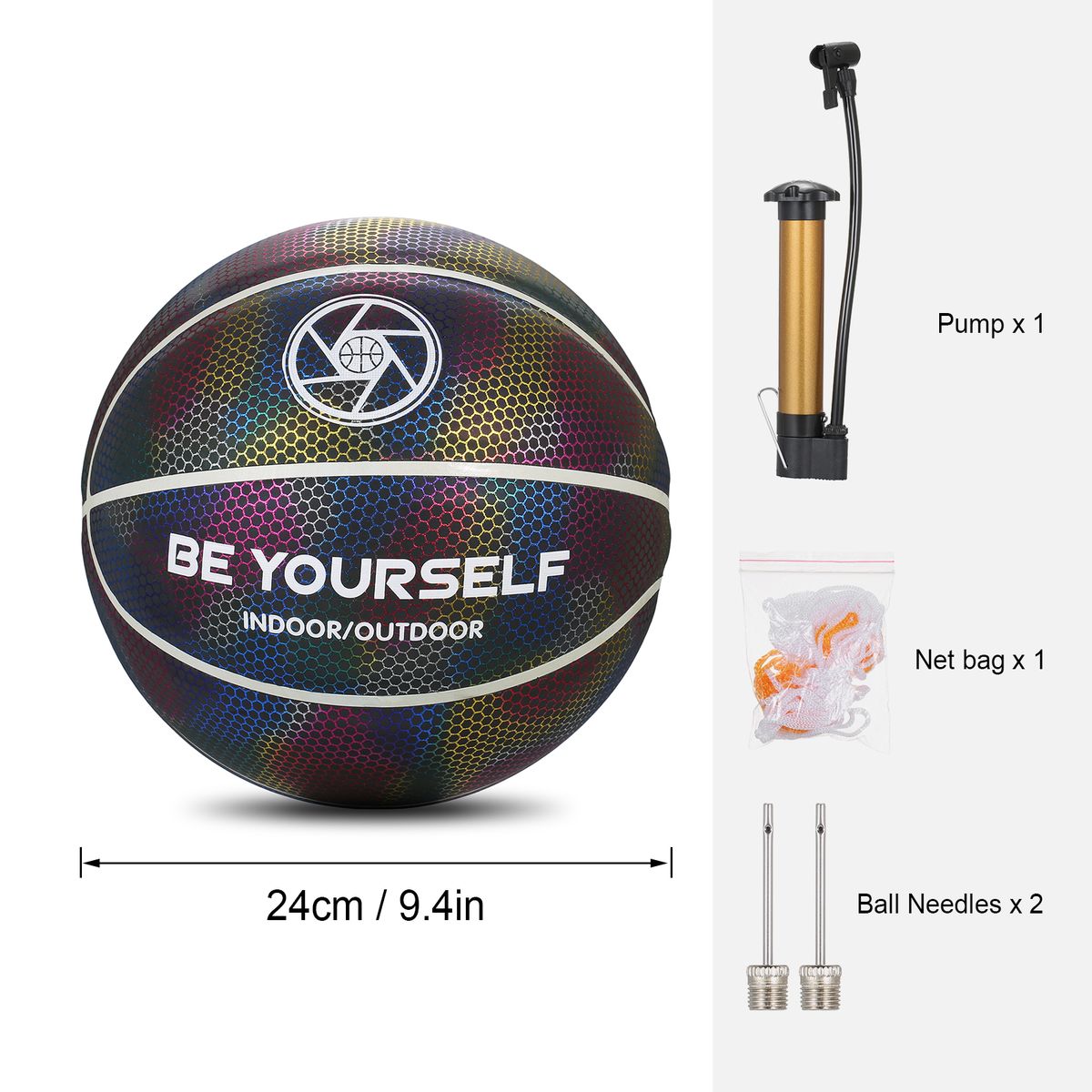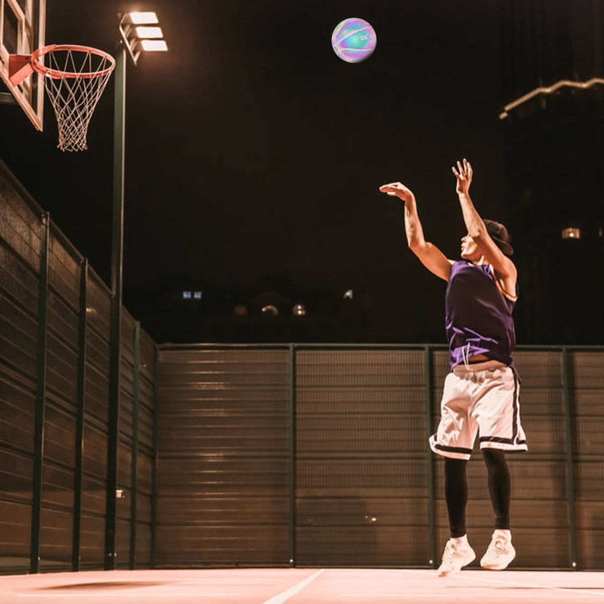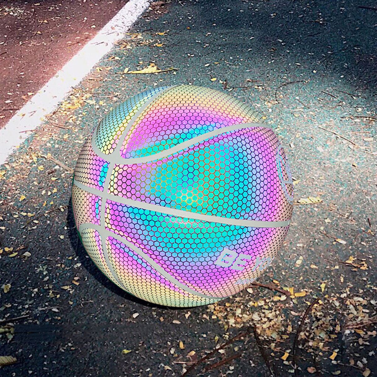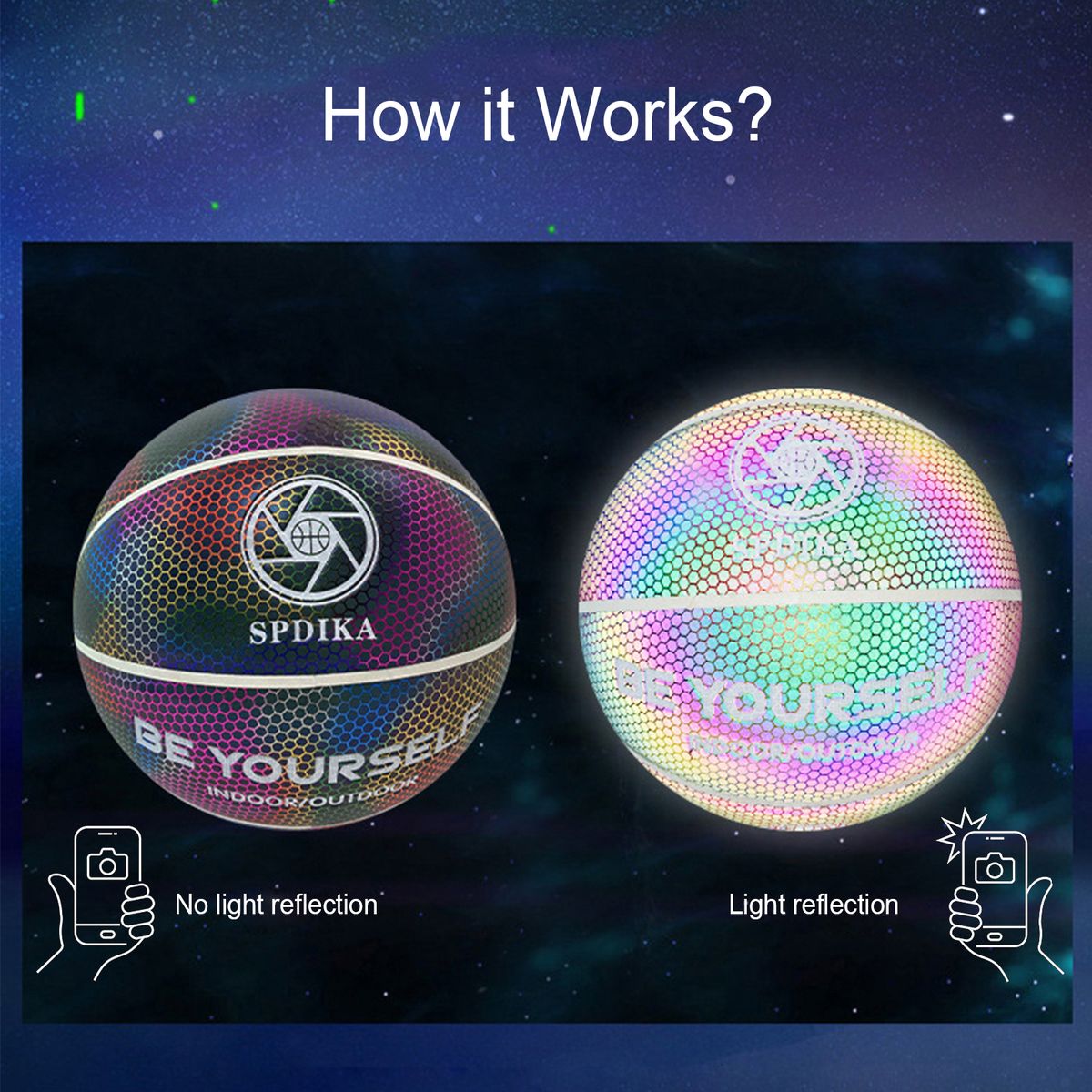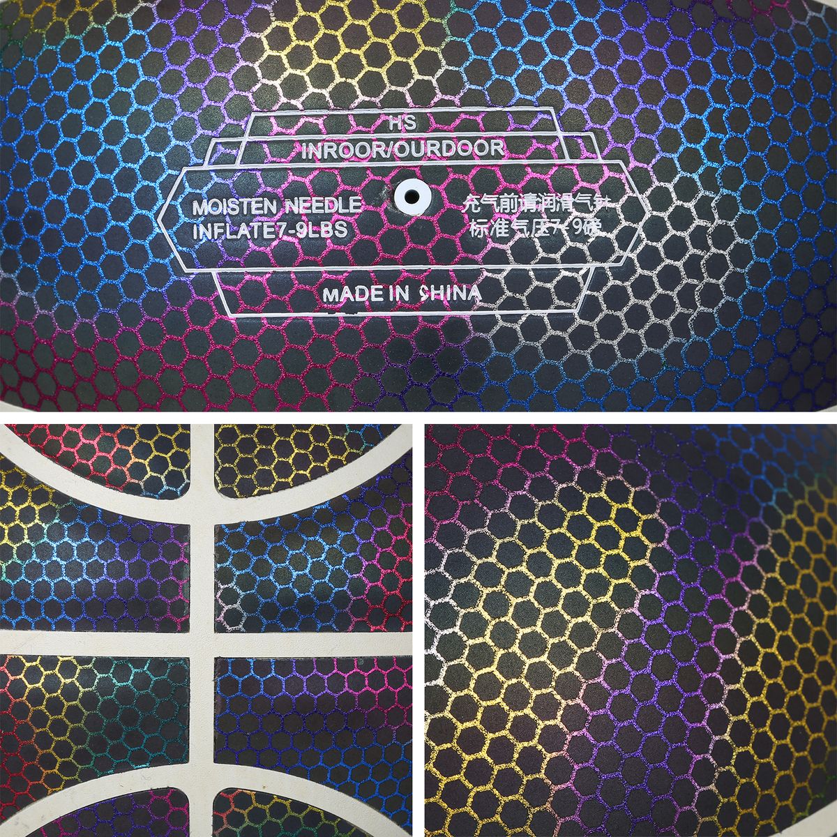 The holographic basketball is made of reflective material. It glows in photos or videos with the camera flash on. Great for sharing on social media, makes you look cool and distinctive, more confident during your showtime.