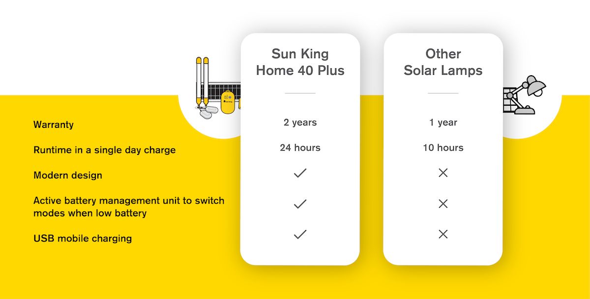 High production quality and attention to durability ensure that Sun King Home 40 Plus customers can enjoy the reliable performance for years around the world.