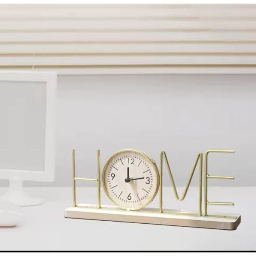 HELLO CLOCK DECOR STAND.Colours available: Gold.Beautiful decor accessory .Home/Office/Hotel/Lounge decor accent..Material: Metal and Wood.The clock works. It requires 1AA battery (not included)..