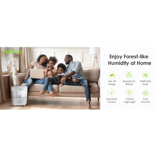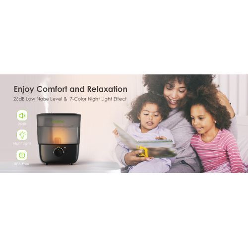 26dB Low Noise: oraimo Cool mist humidifier without loud humming or gurgling noises. It silently humidifies your bedroom with a low noise level of 26 decibels, ideal for your baby and for the distraction-free sleep at night, breathe moist air all night!