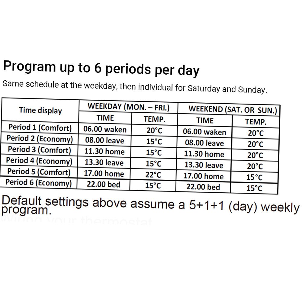 *The schedule for this thermostat can be adjusted to 5-1-1 (Monday through Friday have the same schedule, then individual for Saturday and Sunday).