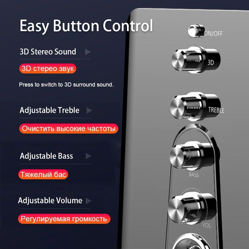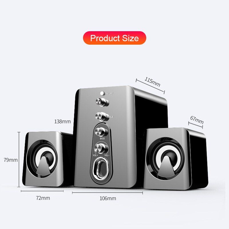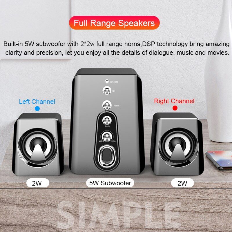 LED USB 2.1 Wired Combination Speaker Ba Music Subwoofer for Desktop Laptop Notebook Tablet PC Smart Phone Home Theater Note If you need Bluetooth, pls choose Bluetooth version to place order! How to adjust the volume to the maxium? 1. When connect to computer, adjust the volume of computer, then clockwisely rotate the volume on to the end. 2. Clockwisely adjust trebleand ba ons to the end, the volume will shock you. Hi-Fi Stereo Dual full-range drivers, experience 2W*2 full-bodied stereo sound with enhanced ba(5w) and powerful volume. Le than 1% total harmonic distortion ensures enhanced clarity and fidelity. Volume Control Rotate the on clockwise or counterclockwise to adjust the volume, convenient to operate. Adjustable Treble Adjustable treble sound multimedia speakers fill a room with so much music comes through crisp and clear which provides you a more enjoyable stereo sound experience, turn your desktop computer or laptop into the sound system. Independent Ba Unit Adjustment ba, rotate the knob and adjust, shows perfect interpretation of all kinds of music. Bluetooth 5.0 With wirele Bluetooth 5.0 technology, connect fast and stable, high-fidelity transmiion and 10 meter Bluetooth range. Speakers wirele compatible with Android, IOS and Windows. AUX Wired Connection Through 3.5mm AUX cable, the speaker can support music software such as Spotify, TuneIn,iHeartRadio, Music,Last.fm,Napster,Rhapsody,SiriusXM Internet Radio, Music etc. USB Power Supply Powered by USB cable, no worry about out of battery. Specification