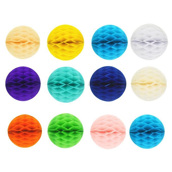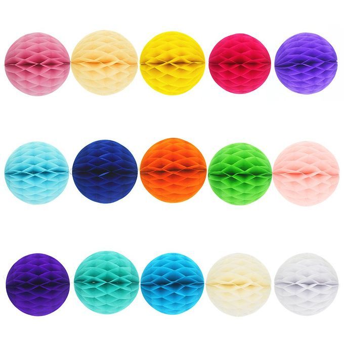 銆怴ibrant HoneyComb Paper Balls銆慍ome in 8 rich colors and about 8 inches in diameter.They are red orange pink white yellow green blue and purple. Make your birthday party a homey cutesy feel.