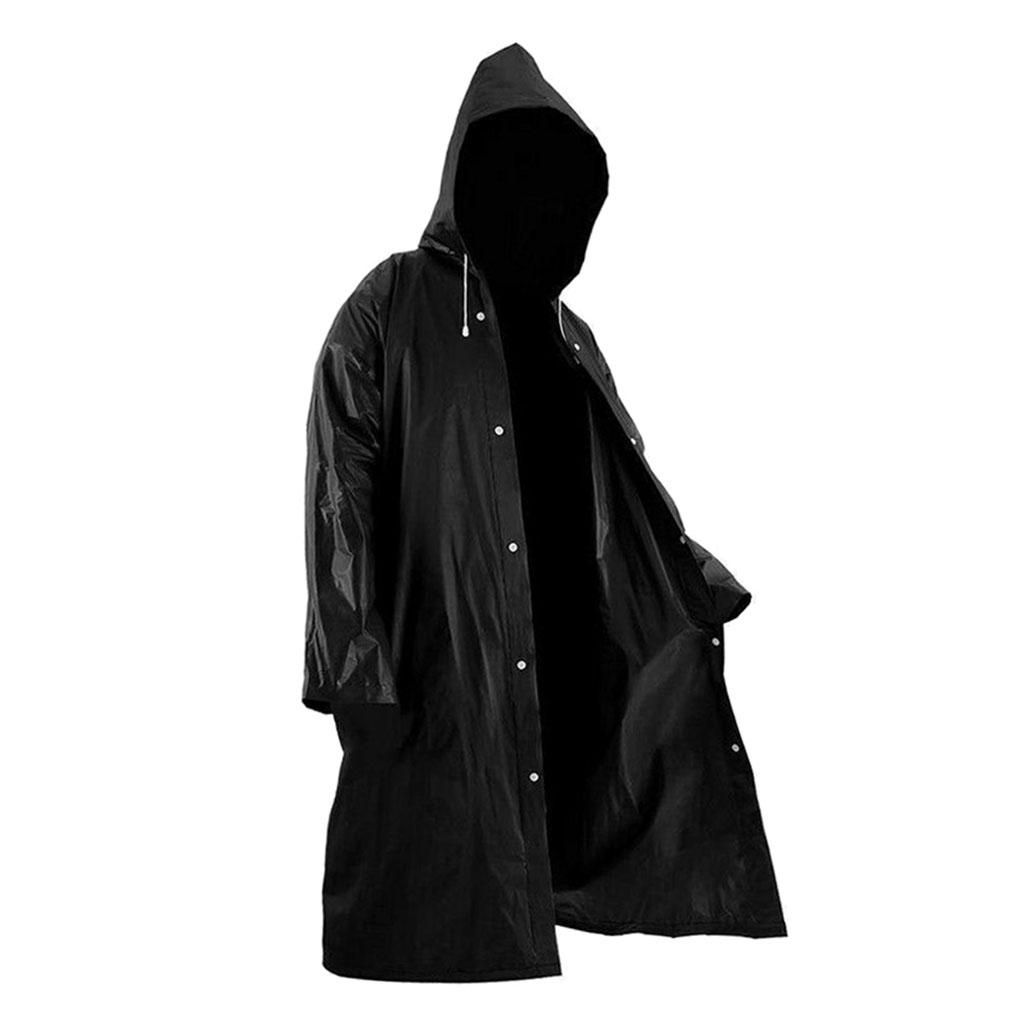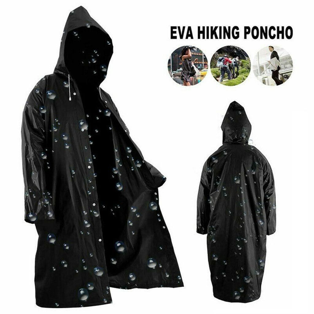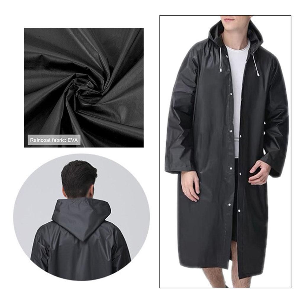Material: made of high qualitu EVA, lightweight, waterproof and quick-drying, packable, skin-friendly and comfortable to wear.Size: Size; length 115cm/45.27 inch, sleeve length 80cm/31.5 inch, chest 130cm/51.2 inch, hood height 30cm/11.81 inch.Knee length jacket, long sleeve, button closure design, Solid black stylish look, simple and match well with all your outfit.The windproof drawstrings at 2 sides of the hood can make the raincoat stay fixed on the head.Suitable for daily wear, camping, hiking, cycling, walking, traveling, walking the dog or other outdoor activities.